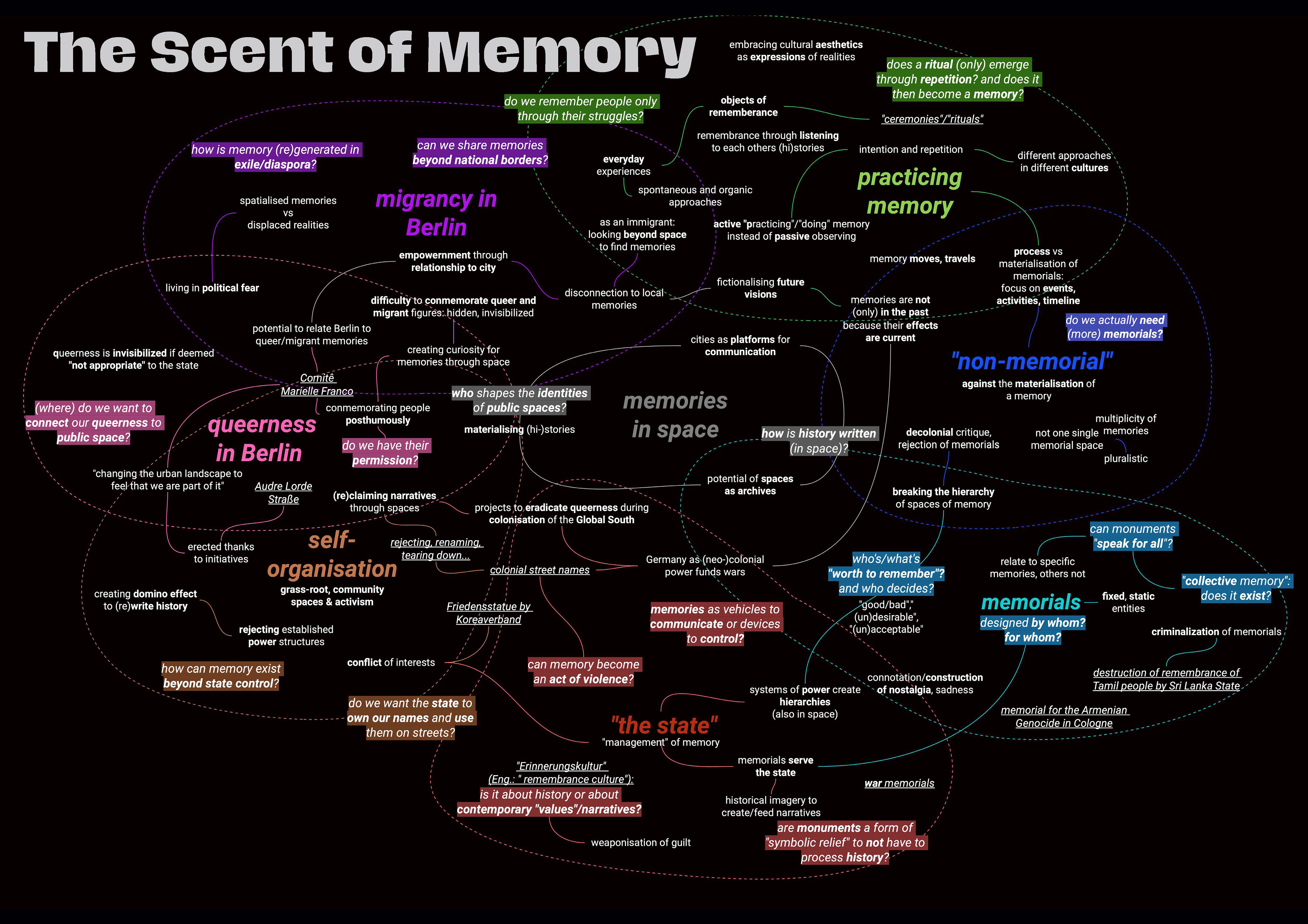 Individual and collective memories create spaces in the city that challenge existing dominant power structures. These memories can manifest spatially, such as through monuments, street signs, or archives that honor individuals or acts of resistance. However, they can also take shape through intangible cultural practices or rituals. Here, memory can become a form of urban practice and city-making. Still, we recognize how fragile these spaces are, even once they have been established. What and how we remember is shaped by limited notions of identity, belonging, and selective memory cultures. Memory spaces are far more than just erected monuments in the city—how can we expand our understanding of them? What role does memory play in the production of queer diasporic spaces? How can tensions, conflicts, as well as the impermanence and fragility of these spaces be negotiated, even after they have been created?