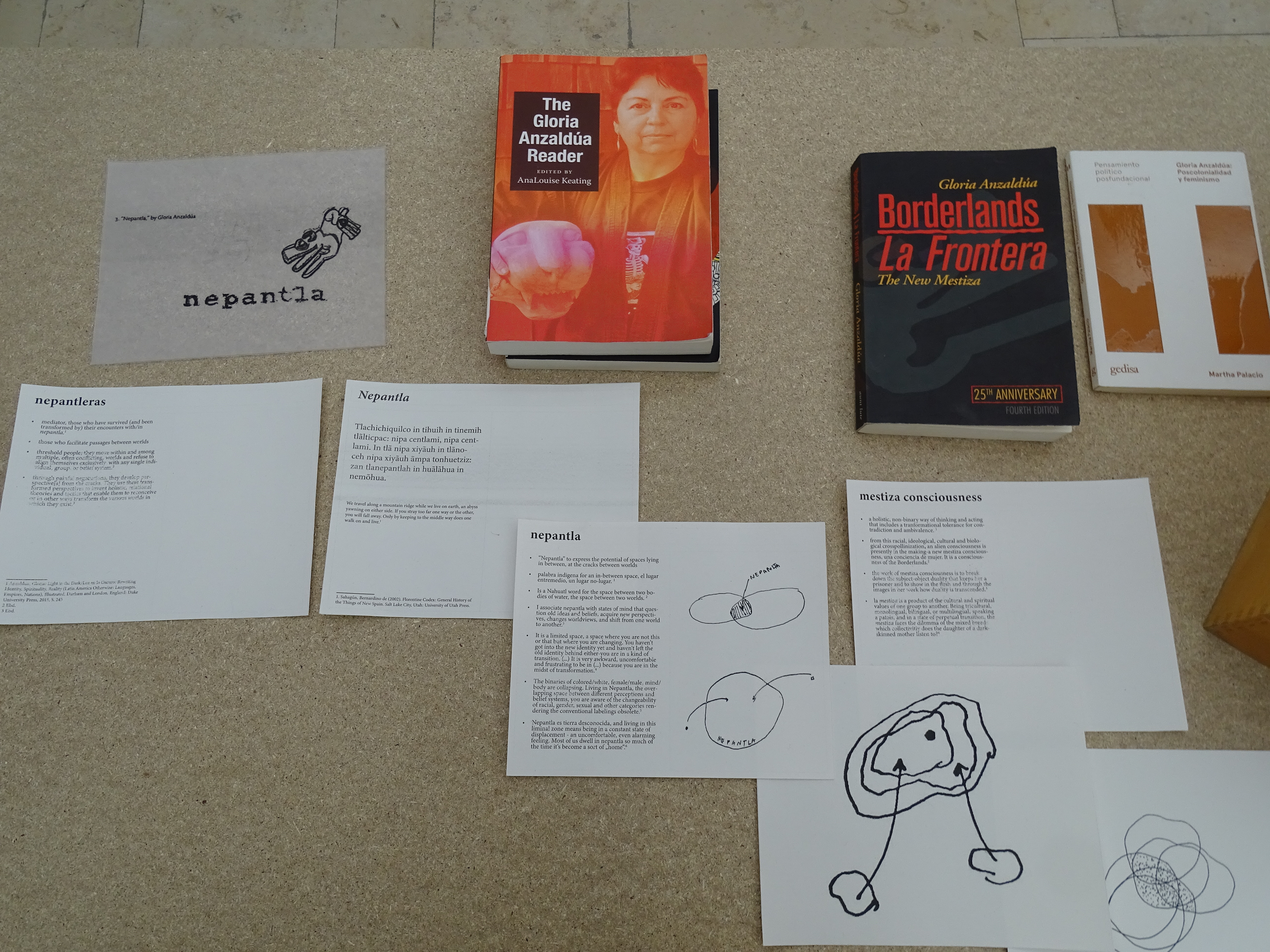 The artistic research “Tracing Nepantla” approaches the concept of nepantla, a space in between, from a spatial perspective. The term nepantla originates from Nahuatl and translates roughly to ‘standing in the middle’. In the 1980s, the author, theorist,self-proclaimed Chicana and lesbian Gloria E. Anzaldúa (1942-2004) developed a language to articulate this feeling of in-betweenness between different, fluid identities and affiliations. Based on the history of the Mexico-US border region, her bilingual book “Borderlands – La Frontera: The New Mestiza” (1987) expands the geographical and cultural understanding of the border space. Anzaldúa illustrates how borderlands are not only physical or spatial constructs but also intersect our lives, manifesting as psychological or sexual boundaries depending on our positionalities.